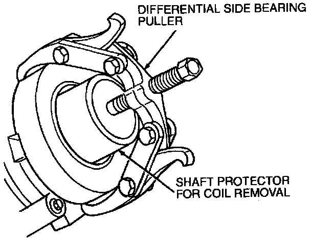 5. Install Differential Side Bearing Puller T77F-4220-B1 or equivalent on the A/C compressor. Place the tip of the puller forcing screw in the center pilot of the shaft protector and the jaws of the puller around the back edge of the A/C clutch field coil.