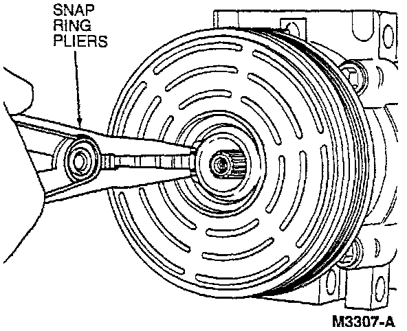 2. Install A/C clutch pulley on A/C compressor. The bearing is a slip-fit on the A/C compressor head and, if properly aligned, should slip on easily.
