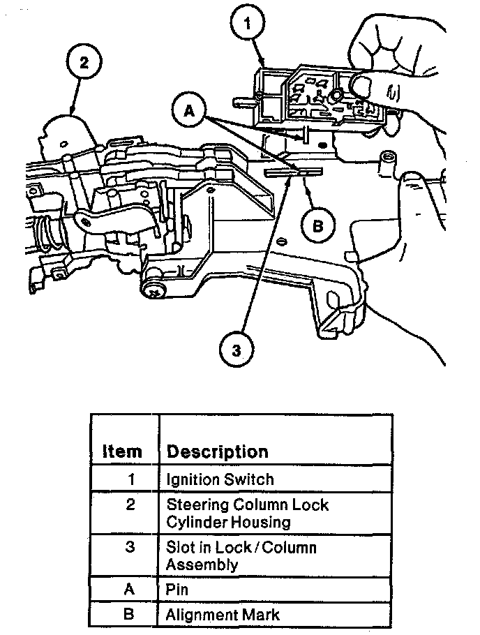 3. Install the ignition switch into the actuator. It may be necessary to move the ignition switch slightly back and forth to align the ignition switch mounting holes with the lock cylinder housing threaded holes.