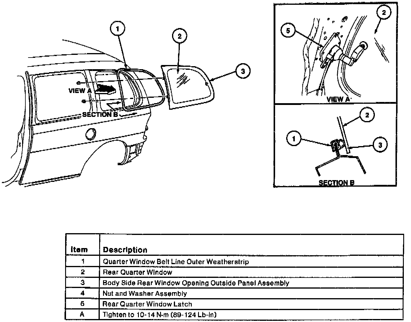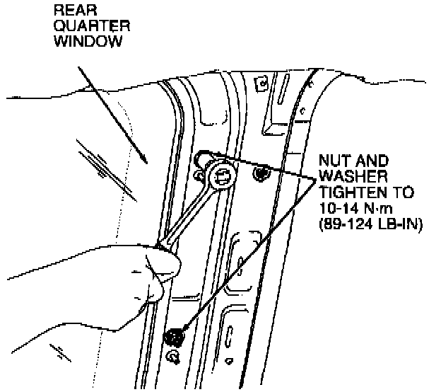 3. Tighten the two rear quarter window hinge nuts to 10-14 Nm (89-124 lb-in).
