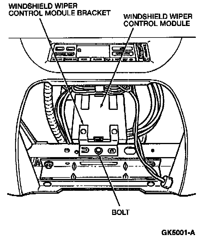 4. Remove bolt retaining windshield wiper control module bracket to instrument panel.