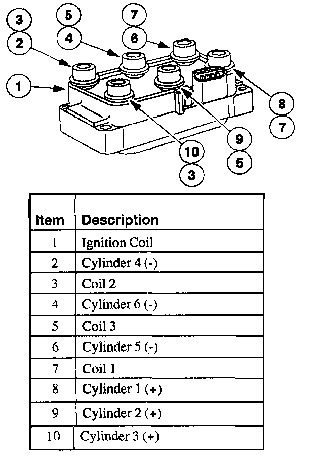 The ignition coil is mounted on top of the intake manifold. The ignition coil contains three separate ignition coils. Each of these ignition coils are controlled by the powertrain control module through three coil leads. Each ignition coil activates two spark plugs simultaneously: