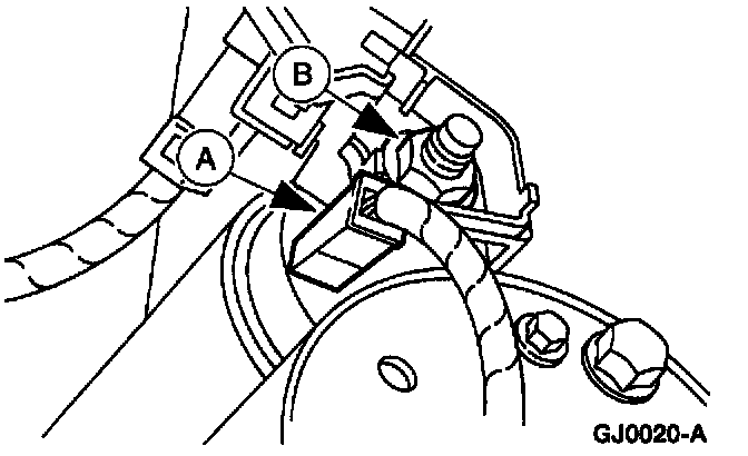 5. Disconnect the (A) S-terminal wire, and the (B) B-terminal nut and cable from the starter motor.