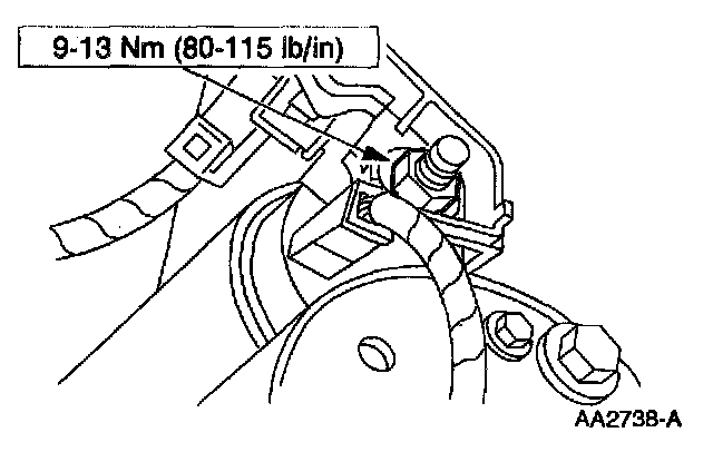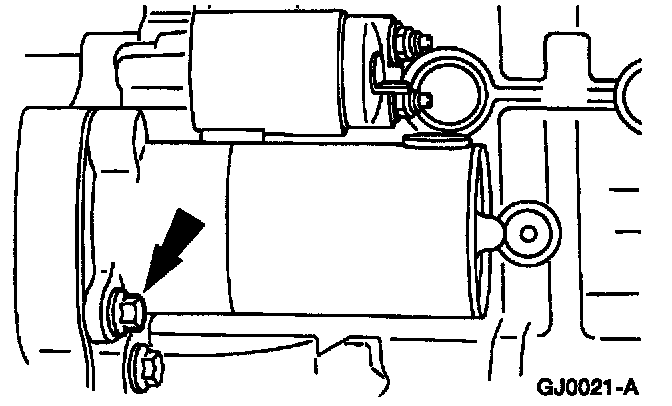 6. Remove the lower starter motor bolt and remove the starter motor and solenoid assembly.