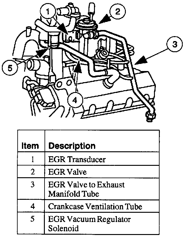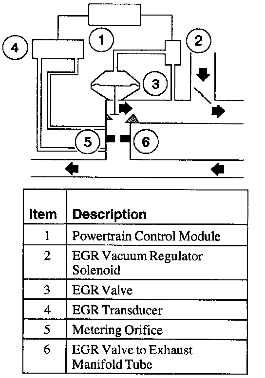 The powertrain control module controls the EGR vacuum regulator solenoid. The EGR vacuum regulator solenoid controls the vacuum to the EGR valve. When the EGR valve opens, exhaust gas flows to the intake manifold. The EGR transducer measures the flow through the EGR valve to exhaust manifold tube and sends a signal to the powertrain control module. A metering orifice in the EGR valve to exhaust manifold tube restricts the flow rate when the EGR valve is open.