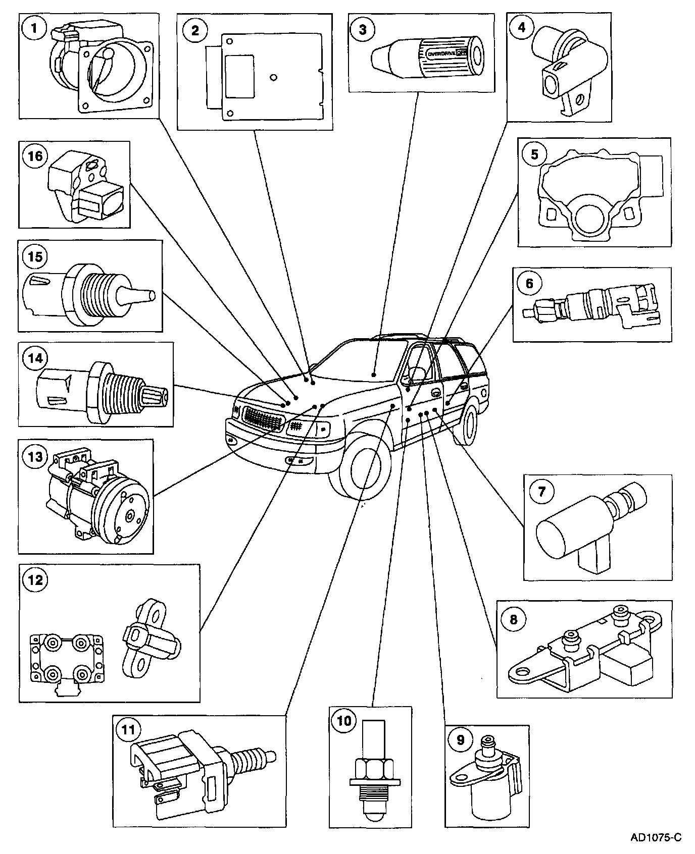 The Throttle Position (TP) sensor is a potentiometer mounted on the throttle body. The TP sensor detects the position of the throttle plate and sends this information to the Powertrain Control Module (PCM). The TP sensor is used for shift scheduling, electronic pressure control and Torque Converter Clutch (TCC) control.