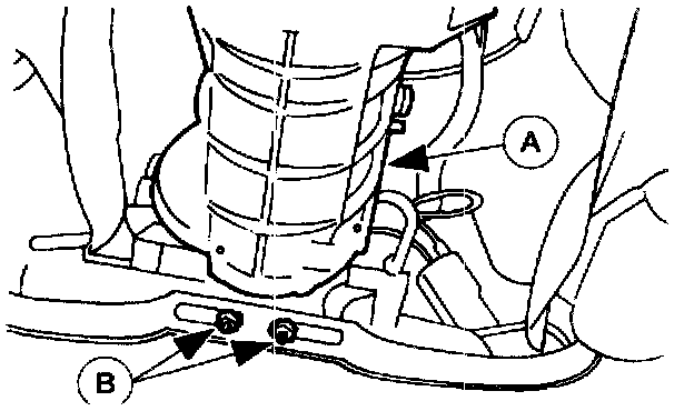 2. Use the High Lift Transmission Jack to support the (A) transmission. Remove the (B) nuts.