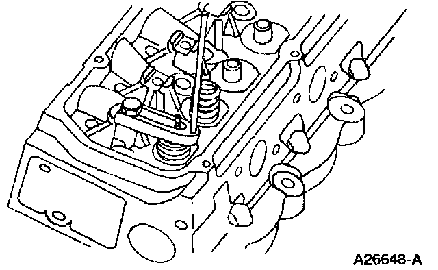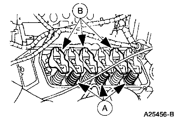 2. Rotate the crankshaft until the piston for the valve being worked on is at the top of its stroke with both the (A) intake valve and the (B) exhaust valve closed.