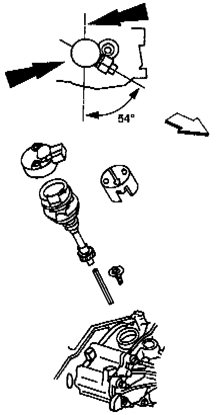 3. Install the camshaft synchronizer housing assembly so the arrow on the Syncro Positioning Tool is 54 degrees from the centerline of the engine.