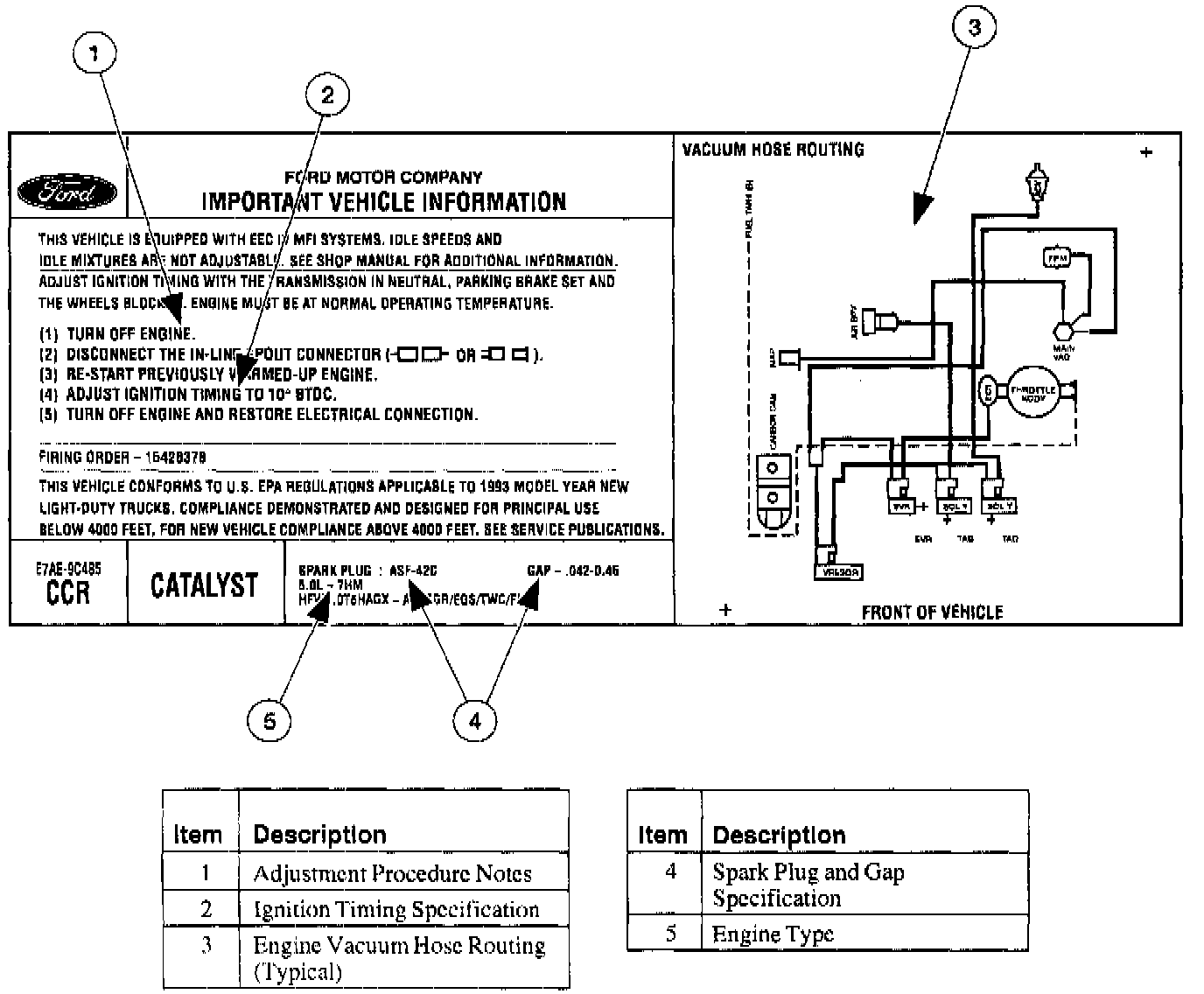 The VECI decal shows the components of the emission control system with the correct vacuum hose routing. The VECI decal shows the color stripe of the vacuum hoses.
