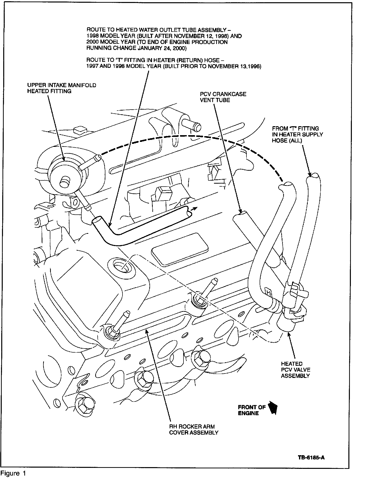 3. In Step 28, connect the 1/4 inch coolant hose to the heater supply hose "T" fitting and route it to the heated PCV assembly in the valve cover. (TSB Figure 1) and 11-12 (Recall Instructions).