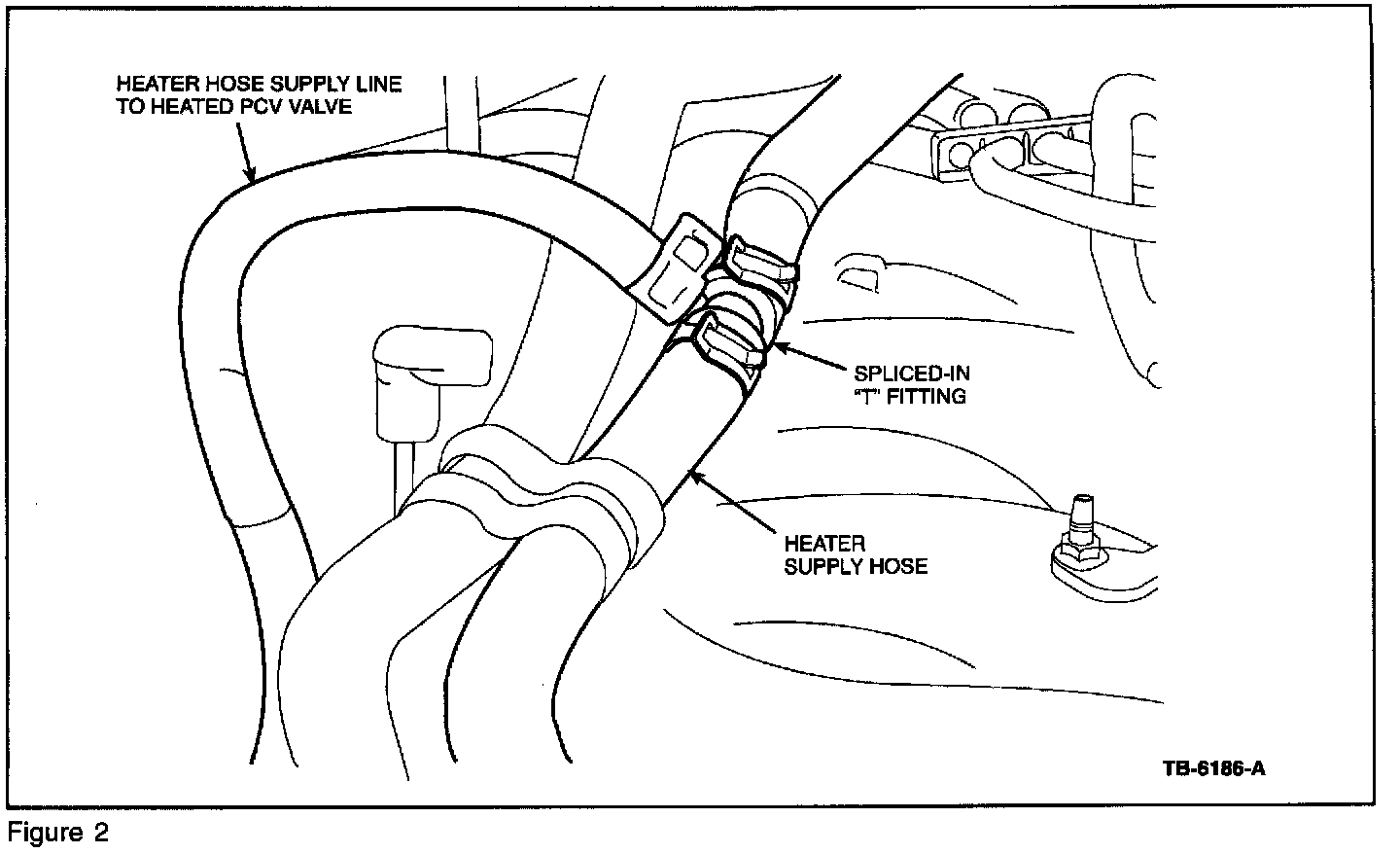 7. Install a 1/4 x 22.5 inch (381175-5225A) coolant hose to the 1/4 inch tap on the tee and route it to the 1/4 inch fitting on the heated PCV valve assembly. Hose can be connected to either 1/4 inch connector, flow direction in the PCV assembly does not matter. Make sure hose is routed so no kinks are present. (See TSB Figure 1 for suggested Routing.) Secure with constant tension clamps (E9ZZ-8287-AA).
