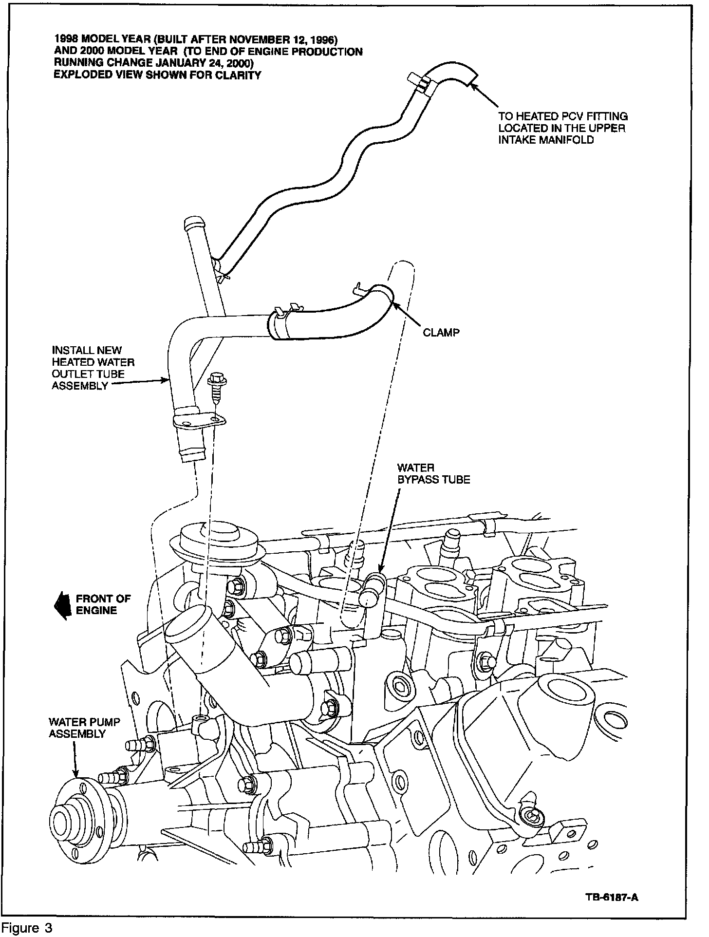 9. Remove the old heater water outlet tube assembly and install the new assembly (1L3Z-18663-BA) with only one 1/4 inch hose connection. (TSB Figure 3).