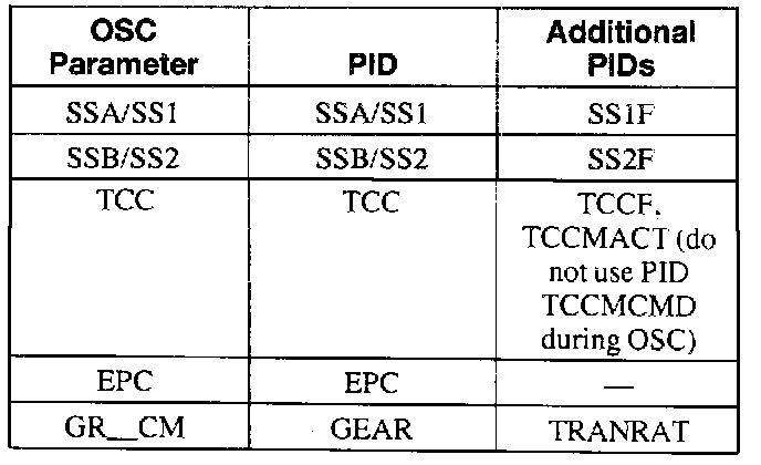To confirm that the Output State Control (OSC) value was sent by the New Generation Star (NGS) and the EEC has accepted the OSC substitution, a corresponding Parameter Identification (PID) for each OSC parameter must be monitored. Additional PIDs should be monitored to help the technician adequately diagnose the transmission.OSC Parameters Chart: