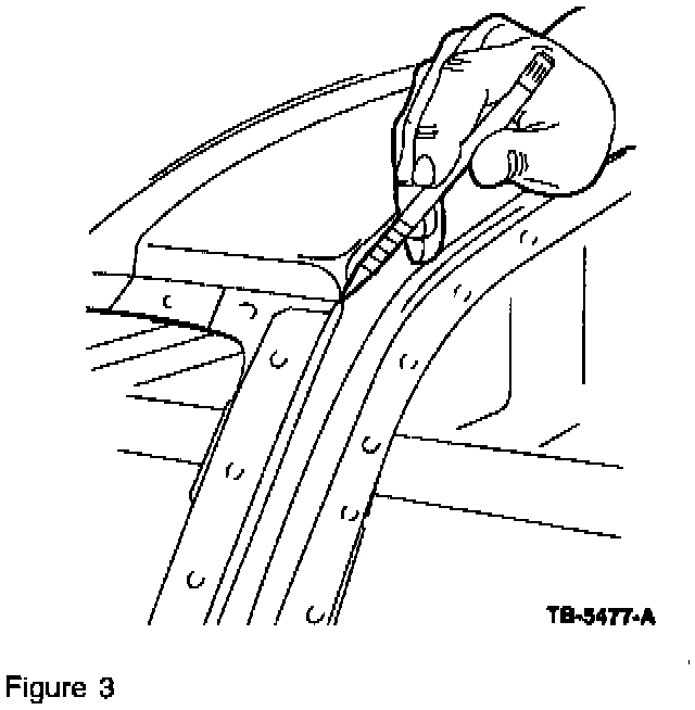 2. Apply a water hose at the bottom center of the windshield and slowly move outboard at a rate of 305 mm (1 foot) per 15-20 seconds. Then move up one side, inboard along top of header to the center. Lift the moulding at top of windshield to allow water to pass through windshield moulding.