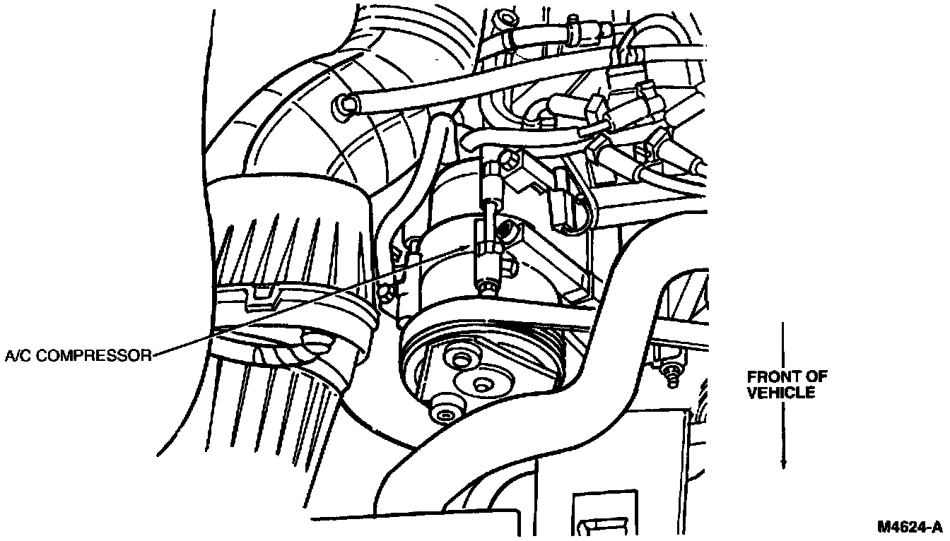 2. Install A/C compressor and retaining bolts. Tighten compressor retaining bolts to 20-30 N.m (15-22 Lb-Ft).