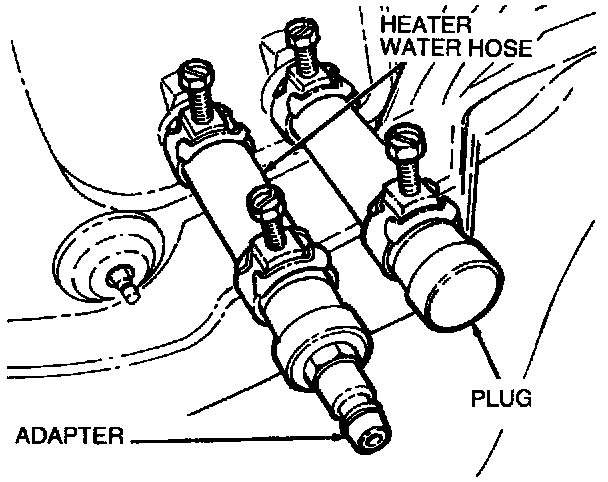 3. Connect the 101 mm (4 inch) test heater water hoses with plug and adapter to the core tubes. Then connect the Rotunda Radiator Pressure Tester 014-R1072 or equivalent to the adapter.