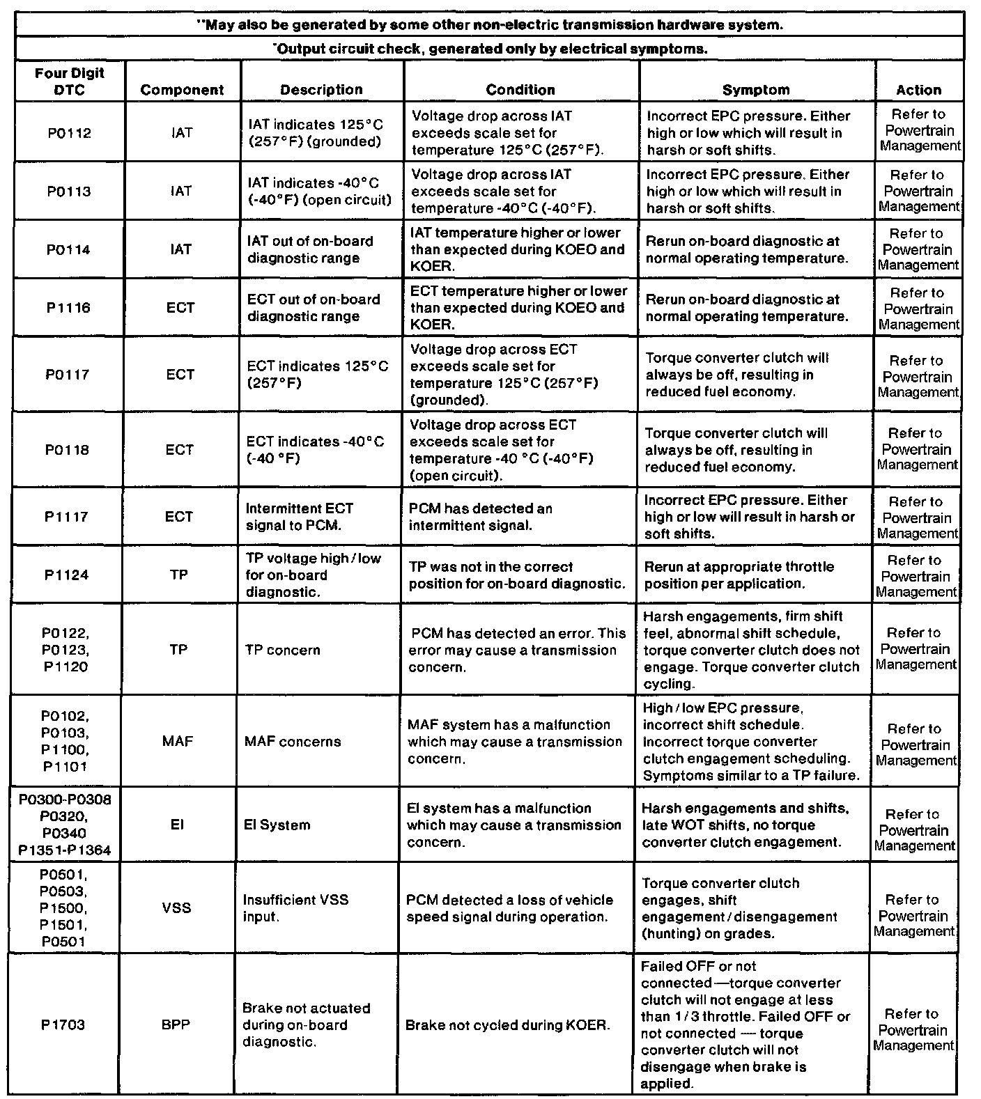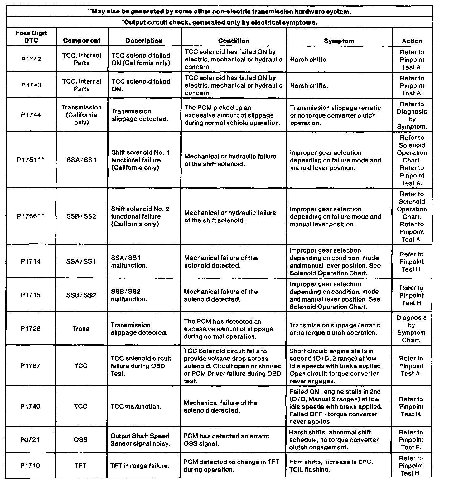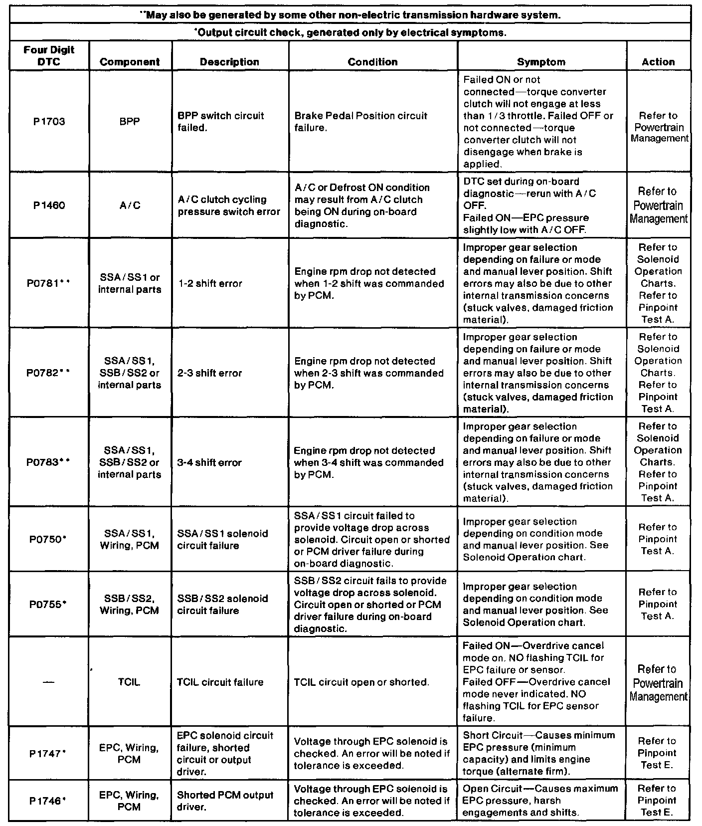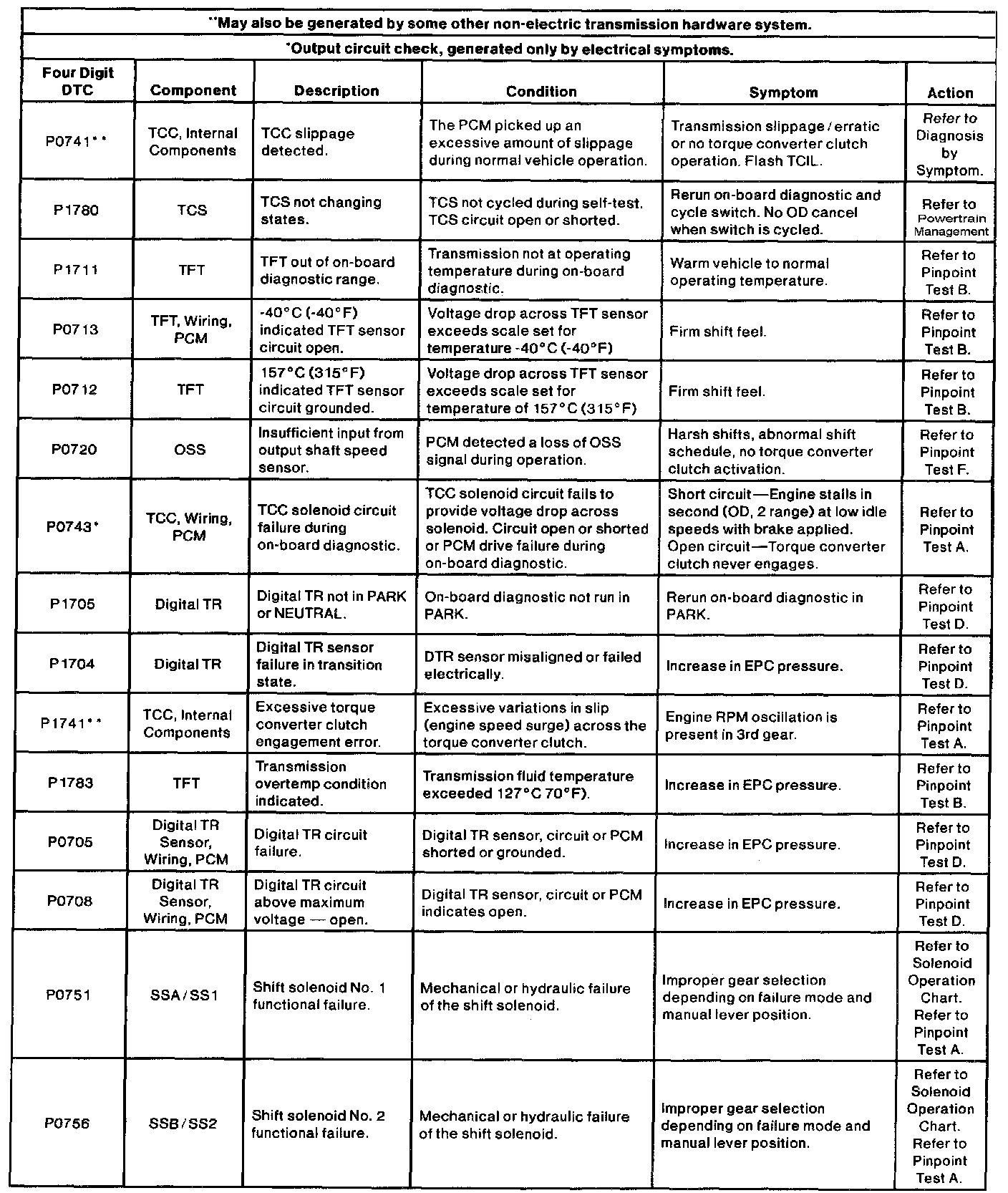 Refer to the On-Board Diagnostic Trouble Code Description Chart for information on condition and symptoms. This chart will be helpful in referring to the proper procedures and to aid in diagnosing internal transmission concerns and external non-transmission inputs. The pinpoint tests are used in diagnosing electrical concerns of the transmission. Make sure that the vehicle wiring harness and the powertrain control module are diagnosed as well.