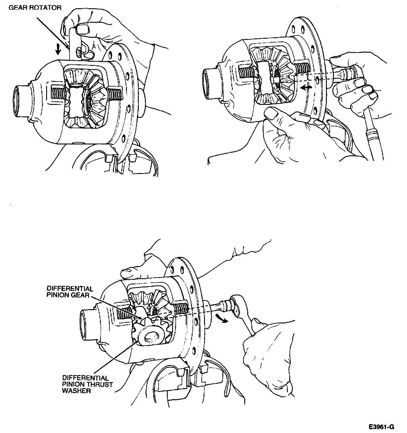 5. Using Gear Rotator 205-134 (T80P-4205-A), rotate the differential pinion gears until the differential pinion gears and differential pinion thrust washers can be removed.
