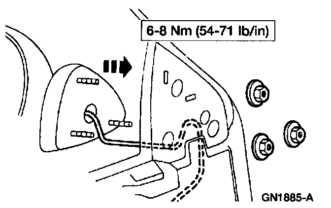 ^ Feed the outside rear view mirror wiring through the opening in the front door.