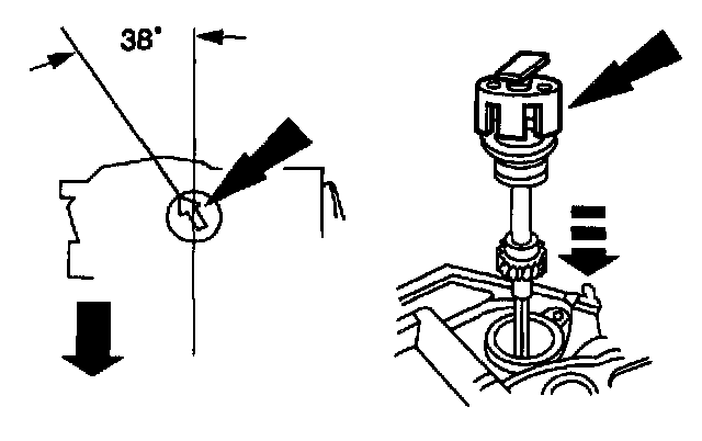 3. Install the camshaft synchronizer housing assembly so the arrow on the Syncro Positioning Tool is 38 degrees from the centerline of the engine.