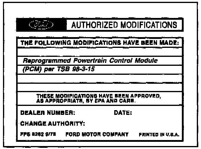 Obtain an Authorized Modification Decal (FPS 8262 - obtainable through DOES II, 25/pkg) and list the date, dealer number, and summary of modifications performed. Select a prominent place adjacent to the Vehicle Emission Control Information Decal suitable for installing the Authorized Modifications Decal. Clean the area, install the decal, and cover it with a clear plastic decal shield.