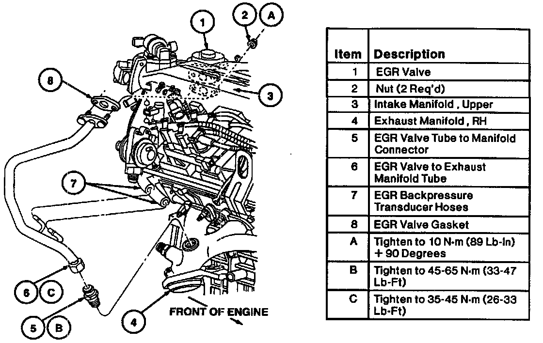 3. Tighten EGR valve tube to manifold connector to exhaust manifold to 45-65 Nm (33-47 lb-ft), if removed.