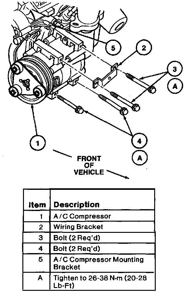 2. Install A/C compressor onto A/C compressor mounting bracket with four bolts and wiring bracket.