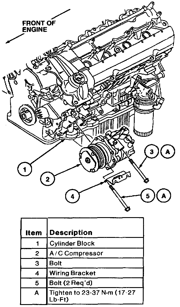 6. Position A/C manifold and tube with O-ring seals onto A/C compressor. Install retaining bolt and tighten to 17-23 N.m (13-16 Lb-Ft).