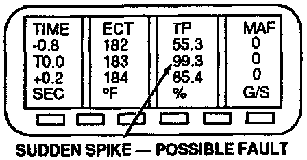 Look for abnormal events or values that are clearly incorrect. Inspect the signals for abrupt or unexpected changes. For example, during a steady cruise most of the sensor values should be relatively stable. Sensors such as TP, MAF, and RPM that change abruptly when the vehicle is traveling at a constant speed are clues to a possible fault area.