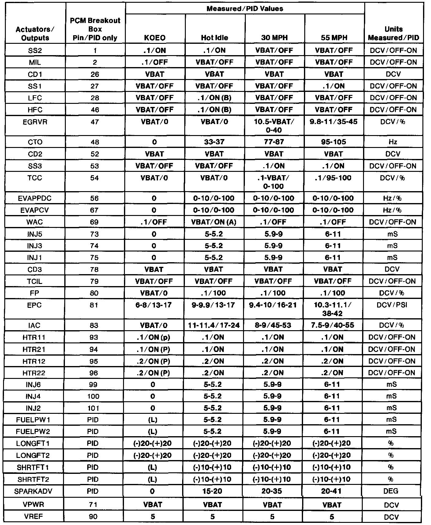 - The Typical Diagnostic Reference Value Charts do not display fault PIDs. These are PIDs which indicate a hard fault with the circuit. They display a value of "YES" or "NO" and are PIDs ending with an "F". These do not include EVAPPF, FF, MAF or VREF.