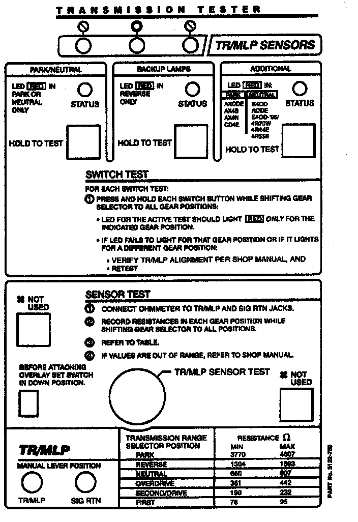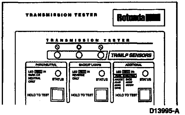 The transmission tester allows you to test the transmission range (TR) sensor independent of the vehicle electronics. TR sensor testing is divided into five steps: