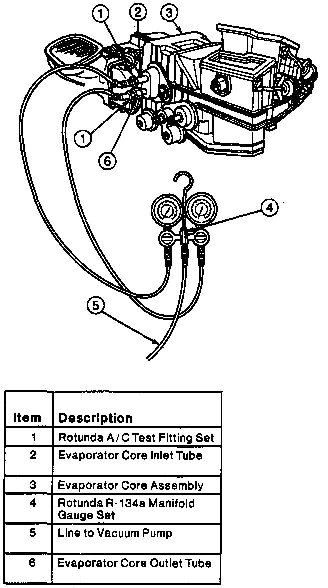 6. Connect the red and blue hoses from the manifold gauge set to the test fittings on the A/C evaporator core or A/C condenser core. Connect the yellow hose to a known good vacuum pump.