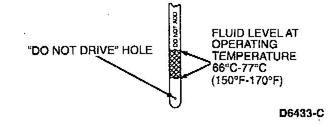 When checking fluid at normal operating temperature, the fluid level should be within the crosshatched area or "HOT" marked area on the fluid level indicator. When the vehicle has not been driven, and the outside temperature is above 10° C (50° F), the fluid level should be between the hole and the lower edge of the crosshatched area on the fluid level indicator.