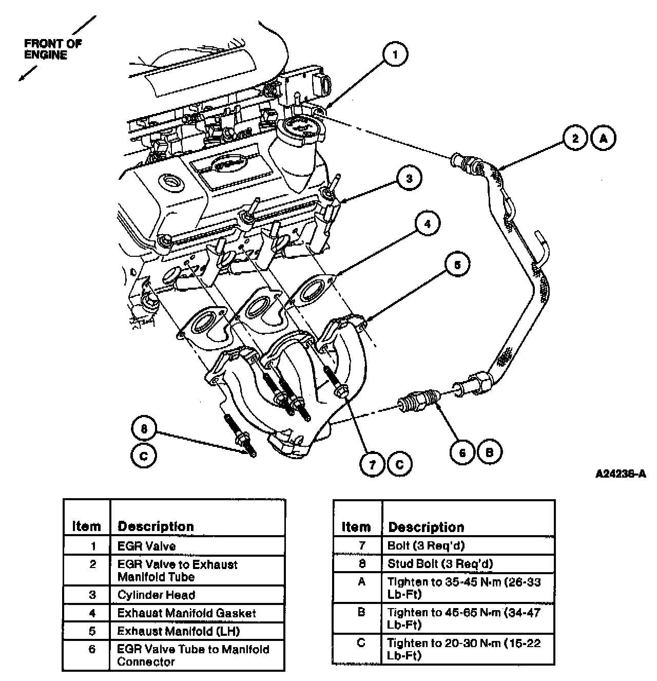 2. Tighten EGR valve to exhaust manifold tube nuts to 35-45 Nm (26-33 lb ft). Tighten EGR valve tube to manifold connector to exhaust manifold to 45-65 Nm (34-47 lb ft), if removed.