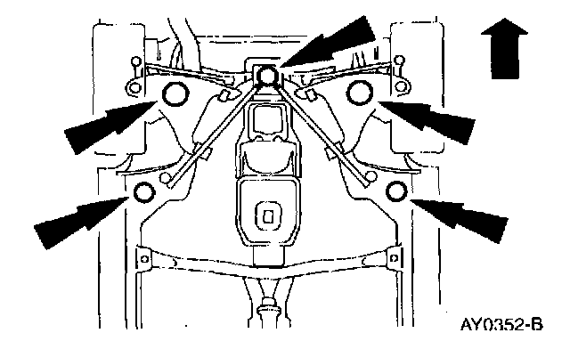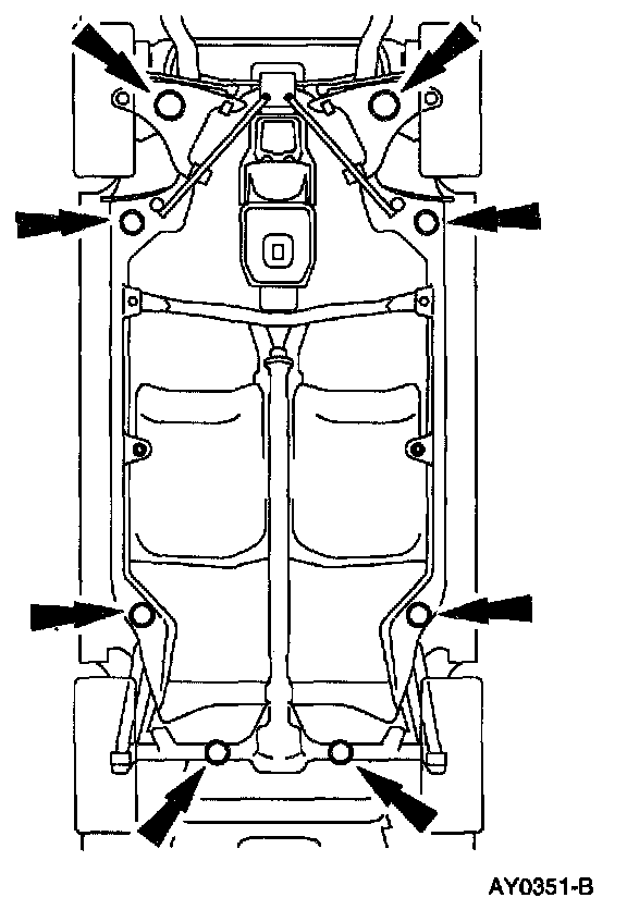^ Do not allow the hoist adapters to contact the steering linkage, suspension arms, stabilizer bar, rear subframe stabilizer brackets or to compress the lower suspension arm stabilizer bar insulator. Damage to the suspension, exhaust and steering linkage components may occur if care is not exercised when positioning the hoist adapters of two-post hoists prior to lifting the vehicle.