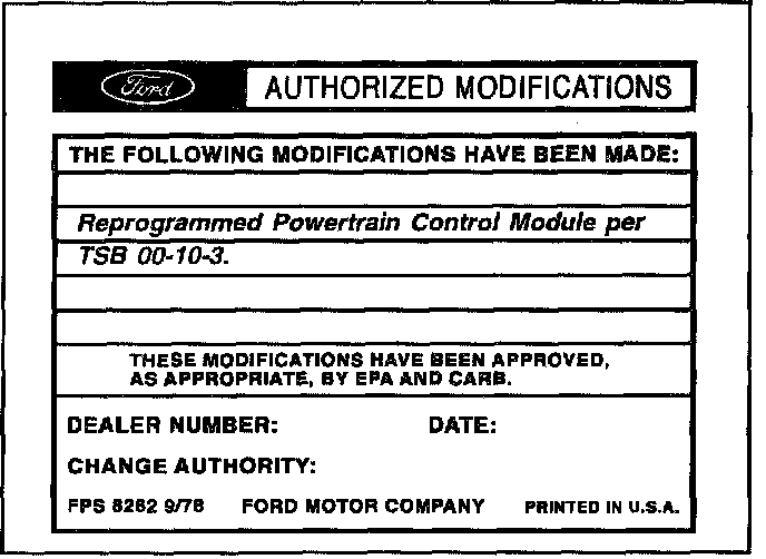 Obtain an Authorized Modifications Decal (FPS 8262 - obtainable through DOES II, 25/pkg) and list the date, dealer number, and summary of modifications performed. Select a prominent place adjacent to the Vehicle Emission Control Information Decal suitable for installing the Authorized Modifications Decal. Clean the area, install the decal, and cover it with a clear plastic decal shield.