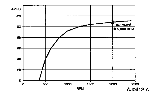4. With the engine running at 2000 rpm, adjust Starter, Alternator, Battery, Regulator and Electrical Tester (S.A.B.R.E) load bank to determine the output of the generator. Generator output should be greater than as shown on the graph. If not, refer to Pinpoint Test A. A: Charge Lamp On W/Eng Running (Low Voltage)