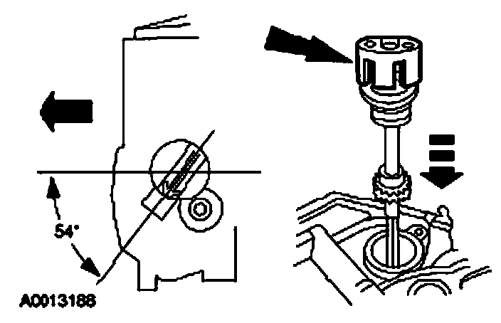 Install the camshaft synchronizer housing assembly so the arrow on the synchronizer alignment tool is 54 degrees from the centerline of the engine.