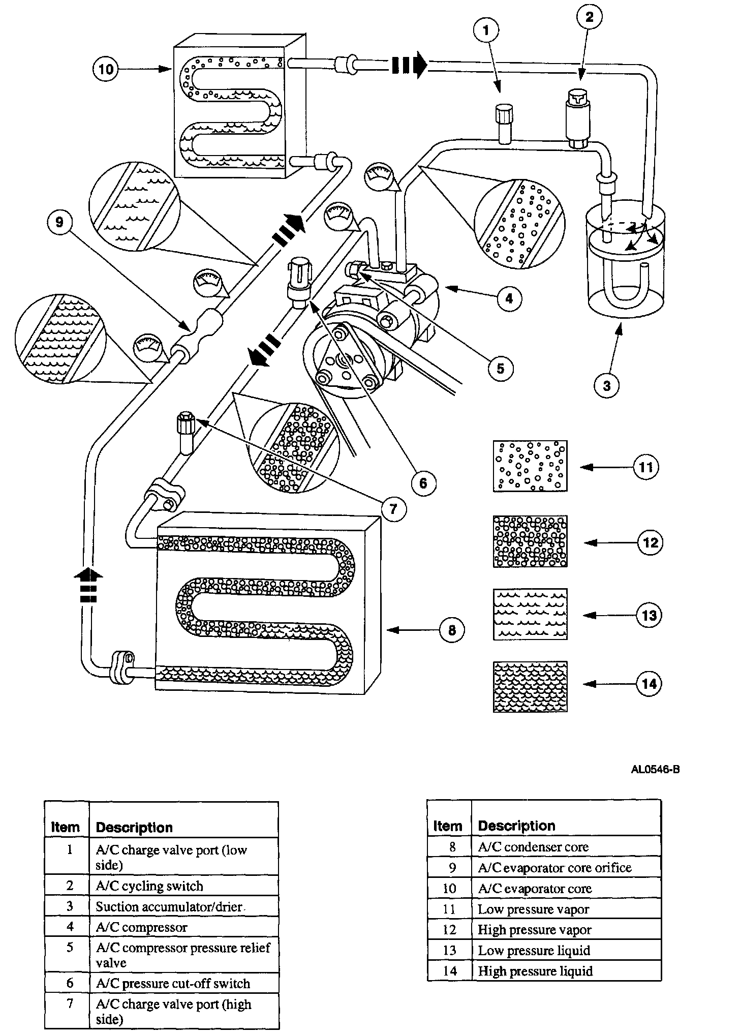 During stabilized conditions (air conditioning system shutdown), the refrigerant is in a vaporized state and pressures are equal throughout the system. When the A/C compressor is in operation it increases pressure on the refrigerant vapor, raising its temperature. The high-pressure and high-temperature vapor is then released into the top of the A/C condenser core.