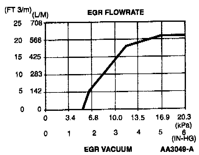The EGR valve in the Differential Pressure Feedback EGR system is a conventional, vacuum-actuated EGR valve. The valve increases or decreases the flow of exhaust gas recirculation. As vacuum applied to the EGR valve diaphragm overcomes the spring force, the valve begins to open. As the vacuum signal weakens, at 5.4 kPa (1.6 in-Hg) or less, the spring force closes the valve. The EGR valve is fully open at about 15 kPa (4.5 in-Hg).