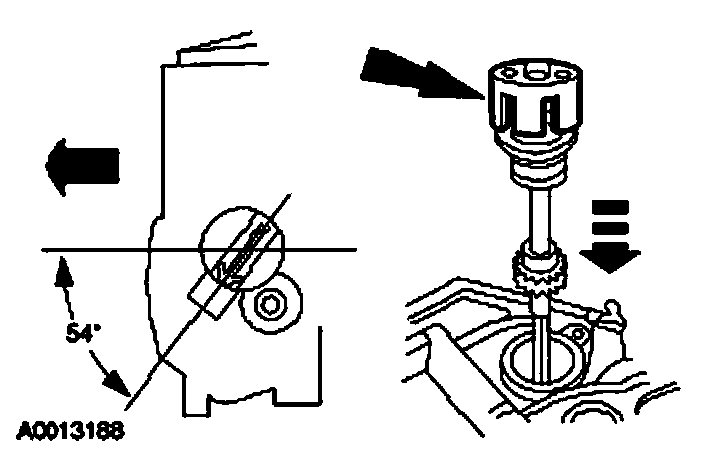 Install the camshaft synchronizer housing assembly so the arrow on the synchronizer alignment tool is 54 degrees from the centerline of the engine.