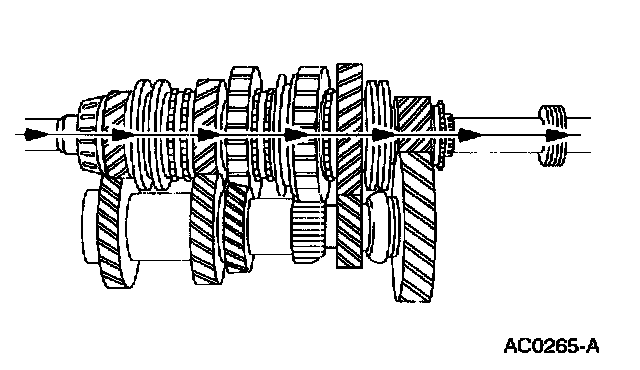 ^ When the synchronizer sleeve is shifted rearward, the 1st gear is engaged to the output shaft through the synchronizer hub.