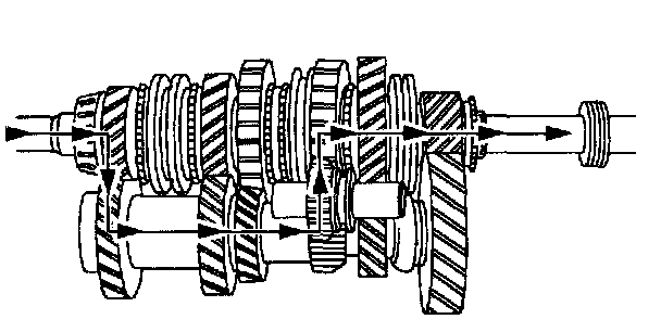 ^ When the synchronizer sleeve is shifted rearward, the 3rd gear is engaged to the output shaft through the synchronizer hub.