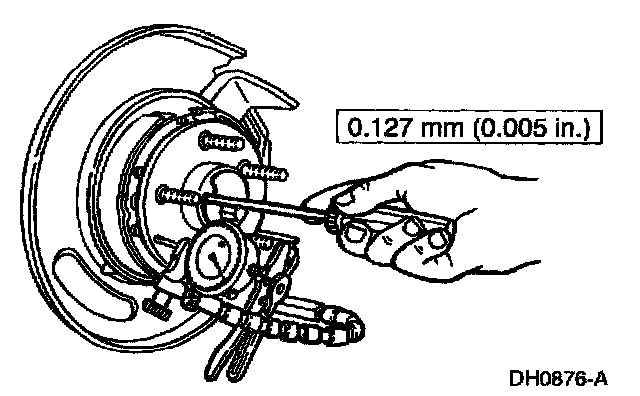 4. Locate an opening on the inboard side of the dust shield that will allow the dial indicator tip to be positioned at least 5 mm (0.2 inch) from the outer edge of the brake disc.