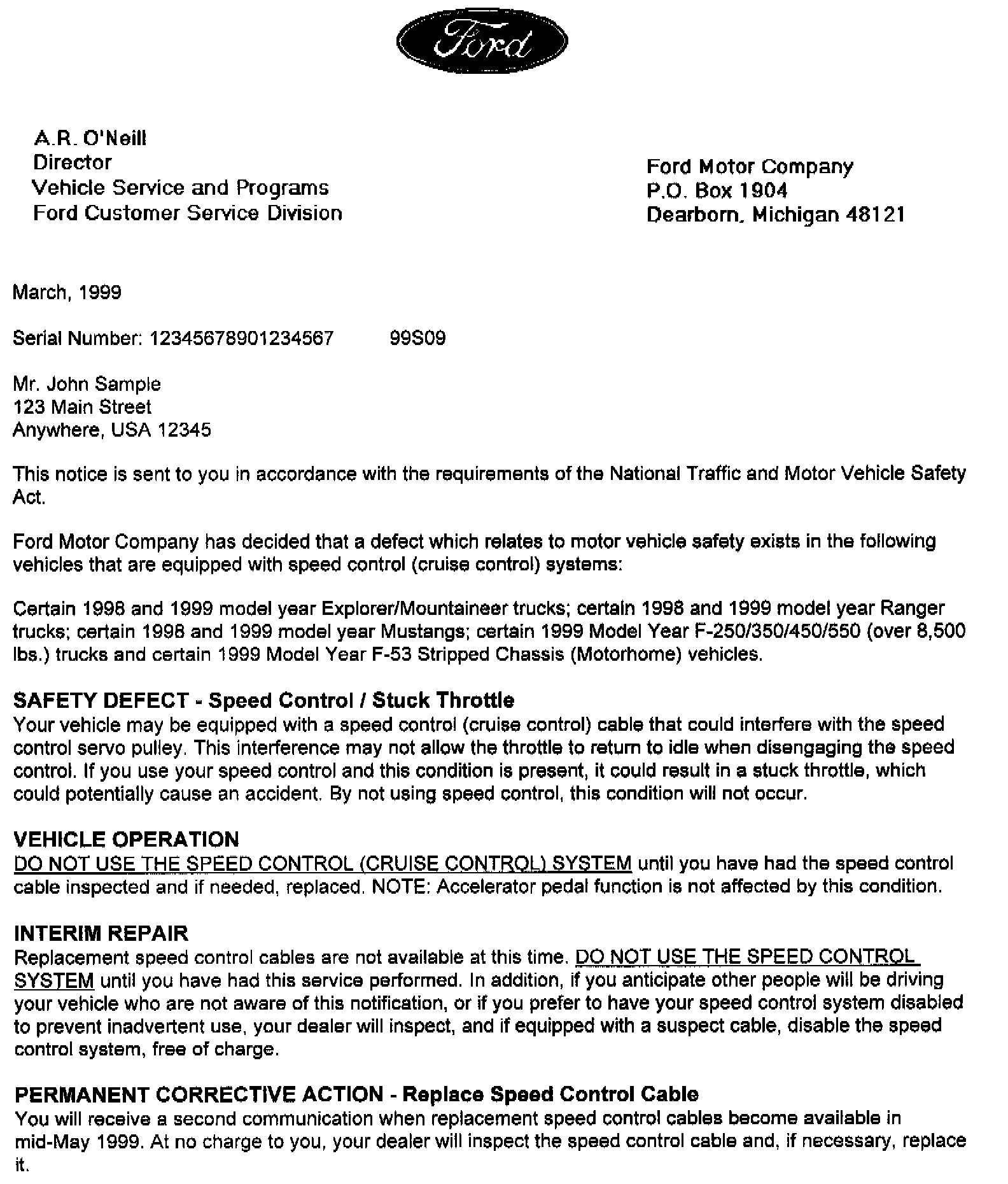 Recall - Speed Control Cable Replacement