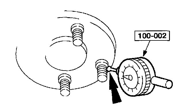 2. Rotate the hub or flange until the next bolt is contacted. Record the measurement and continue until each bolt is checked. The difference between the maximum and minimum contact readings will be the total wheel hub or axle flange bolt pattern runout. The runout must not exceed 0.38 mm (0.015 inch).