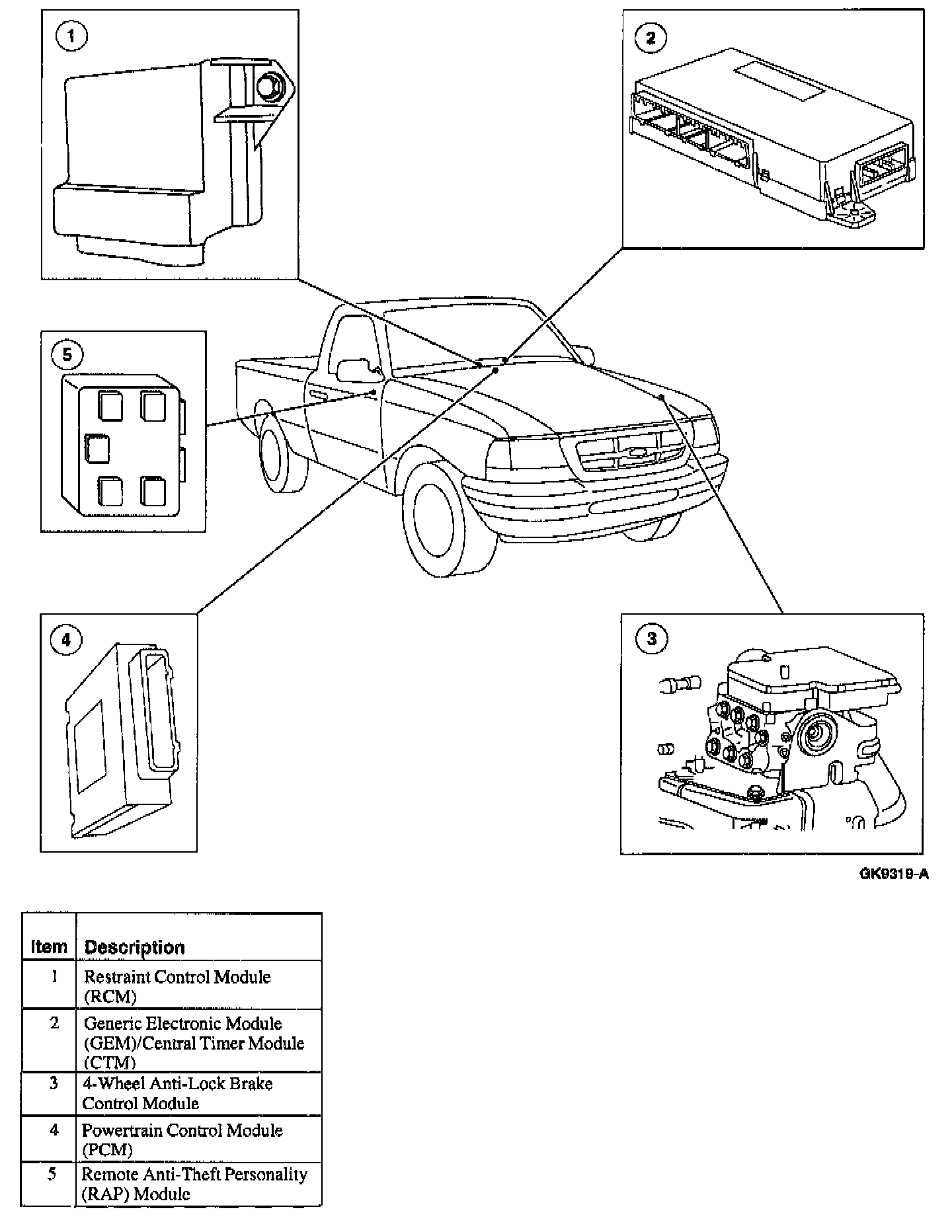The Generic Electronic Module (GEM) and the Central Timer Module (CTM) are on the ISO 9141 network. Only one GEM or one CTM will be on a vehicle. The CTM will show up as a GEM on the NGS Tester. The GEM is equipped on vehicles with 4-wheel drive or vehicles with power windows. The CTM is equipped on vehicles with 2-wheel drive and vehicles without power windows. The GEM controls additional functions that include: