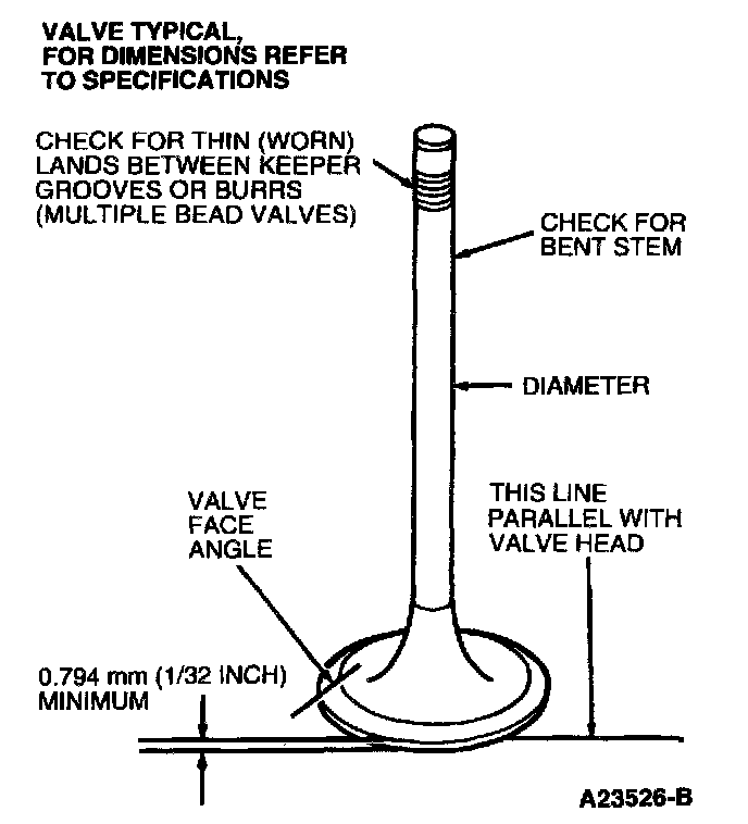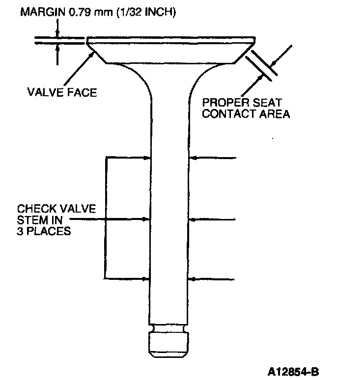 Using a micrometer, check valve stem in three places to make sure it is within specification. If the valve stem is not within specifications or if the valve is damaged, DISCARD VALVE. Minor pits, grooves or runout in the valve face may be removed by refacing.