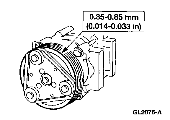 2. Remove the A/C clutch. Add or remove spacers between the A/C clutch and the compressor shaft until clearance is within specification.